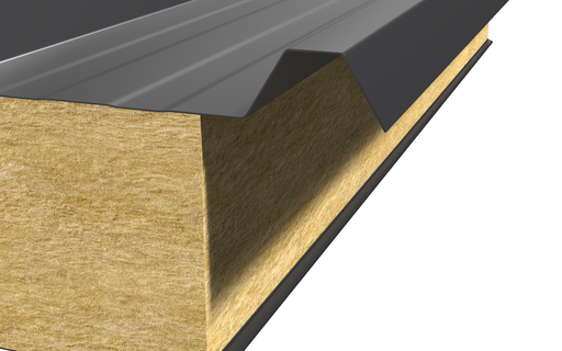 Толщина кровельных сэндвич-панелей варьируется от 50 до 300 мм, что позволяет выбрать оптимальное решение под регион эксплуатации и особенности объекта. Утеплитель из минеральной ваты обеспечивает надёжную тепло- и звукоизоляцию, а жесткие внешние оцинкованные металлические листы с антикоррозийным полимерным покрытием устойчивы к влаге, ультрафиолету и механическим повреждениям. Специальный профиль верхнего листа формирует дополнительное ребро жёсткости и улучшает водоотвод, препятствуя застою осадков на крыше.